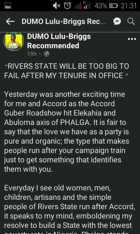 A governorship candidate in Rivers state named Dumo Lulu- briggs has come out on his official social media page to write a post which he tagged " RIVERS STATE WILL BE TOO BIG TO FAIL AFTER MY TENURE IN OFFICE. " This post of his really did get a lot of reactions and comments from the public space.
