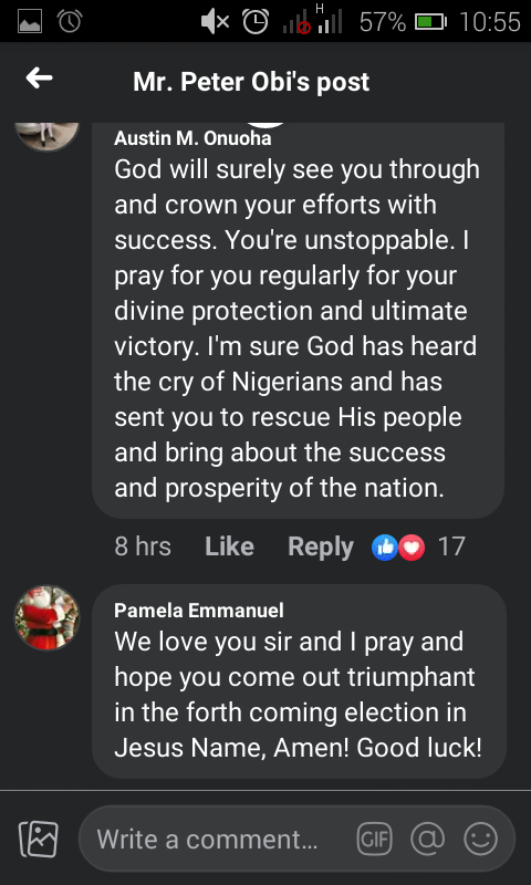 “You’re unstoppable. I pray for you regularly for your divine protection and ultimate victory. I’m sure God has heard the cry of Nigerians and has sent you to rescue His people and bring about the success and prosperity of the nation” – The commenter wrote.