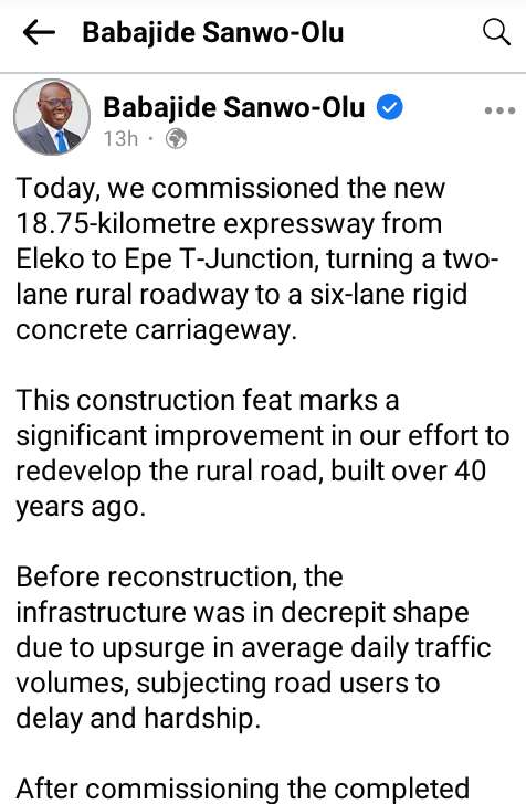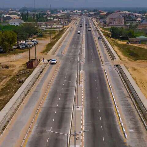 "Today, we commissioned the new eighteen kilometer and seventy-five meters expressway from Eleko to Epe T-Junction, turning a two-lane rural roadway to a six-lane rigid concrete carriageway."